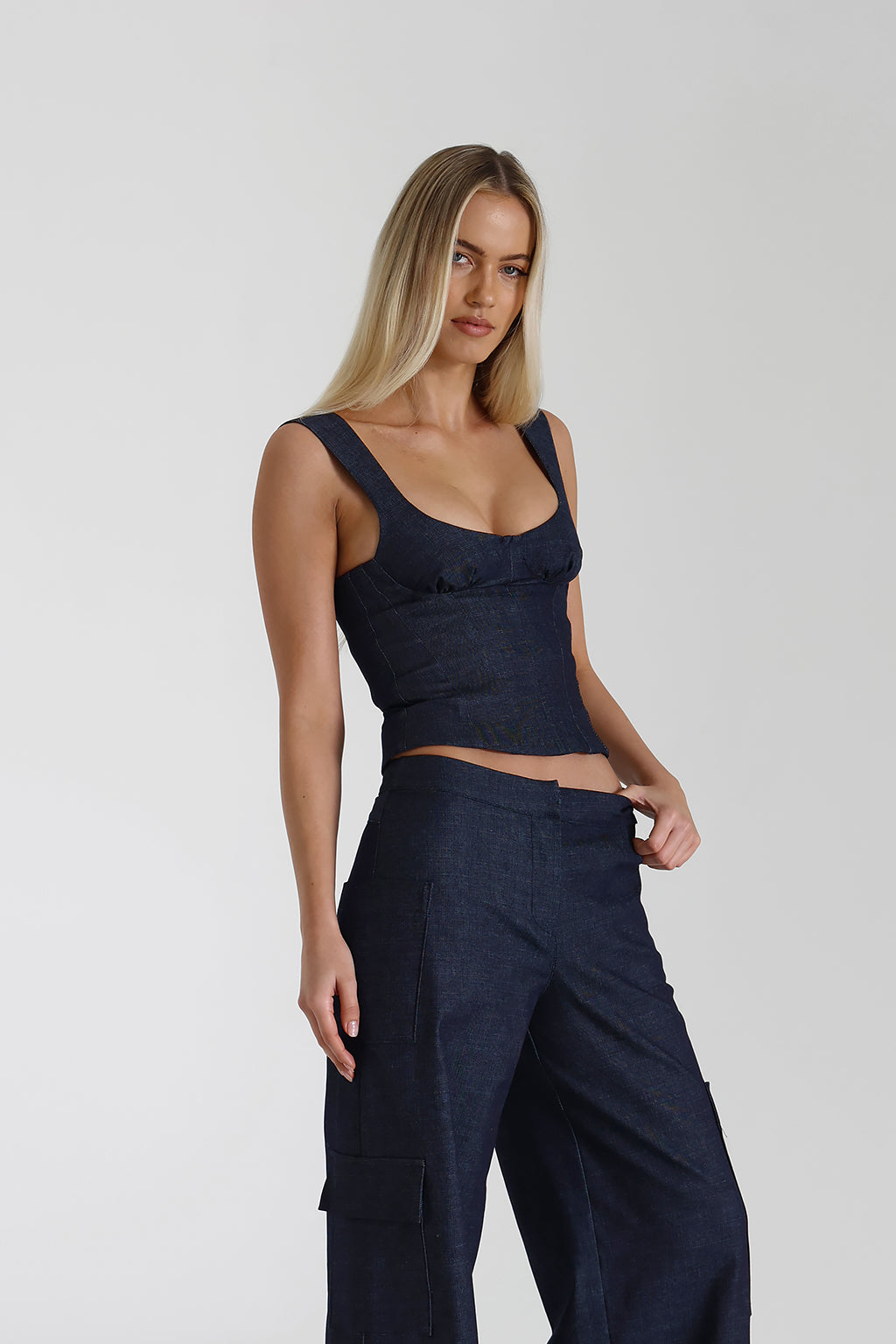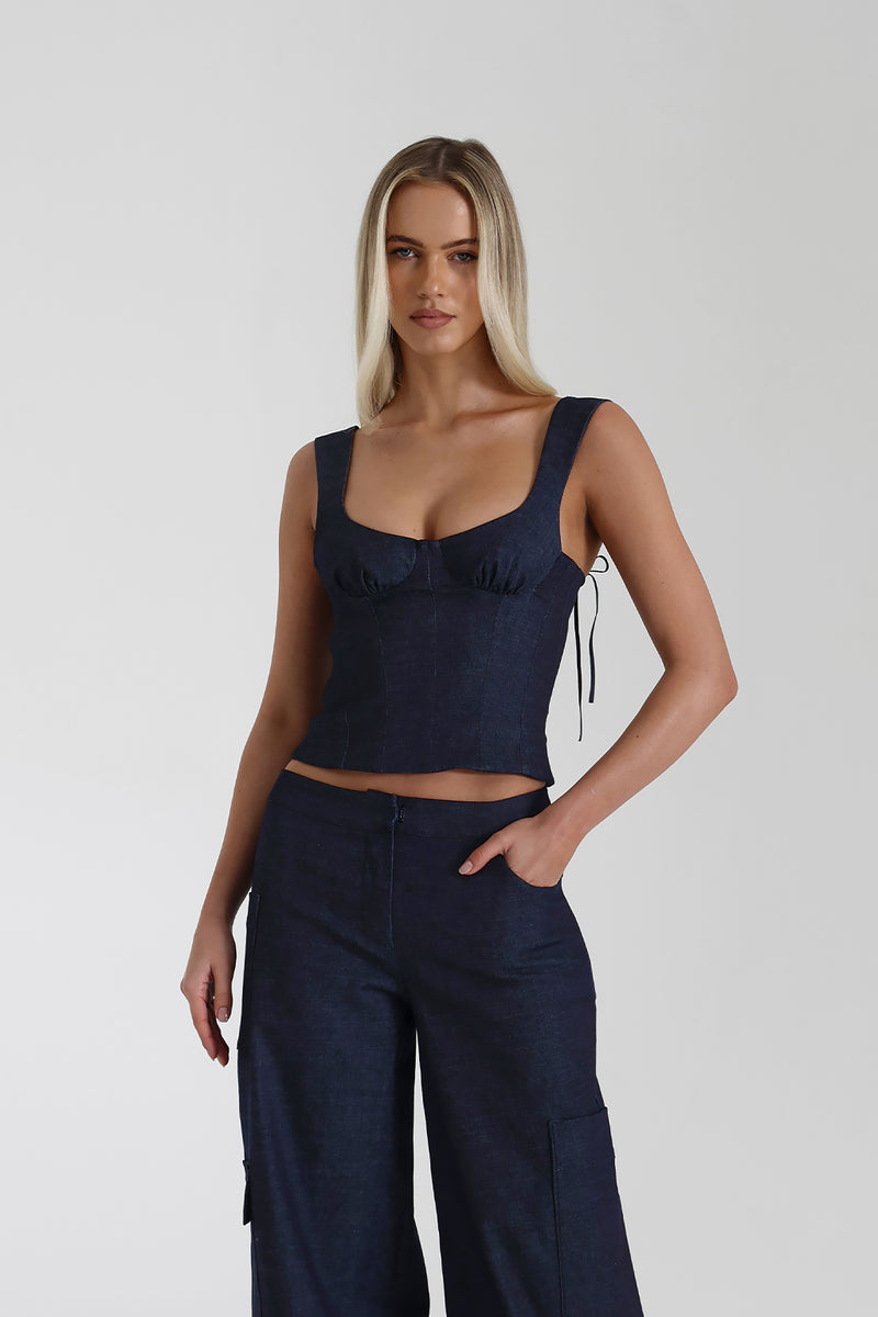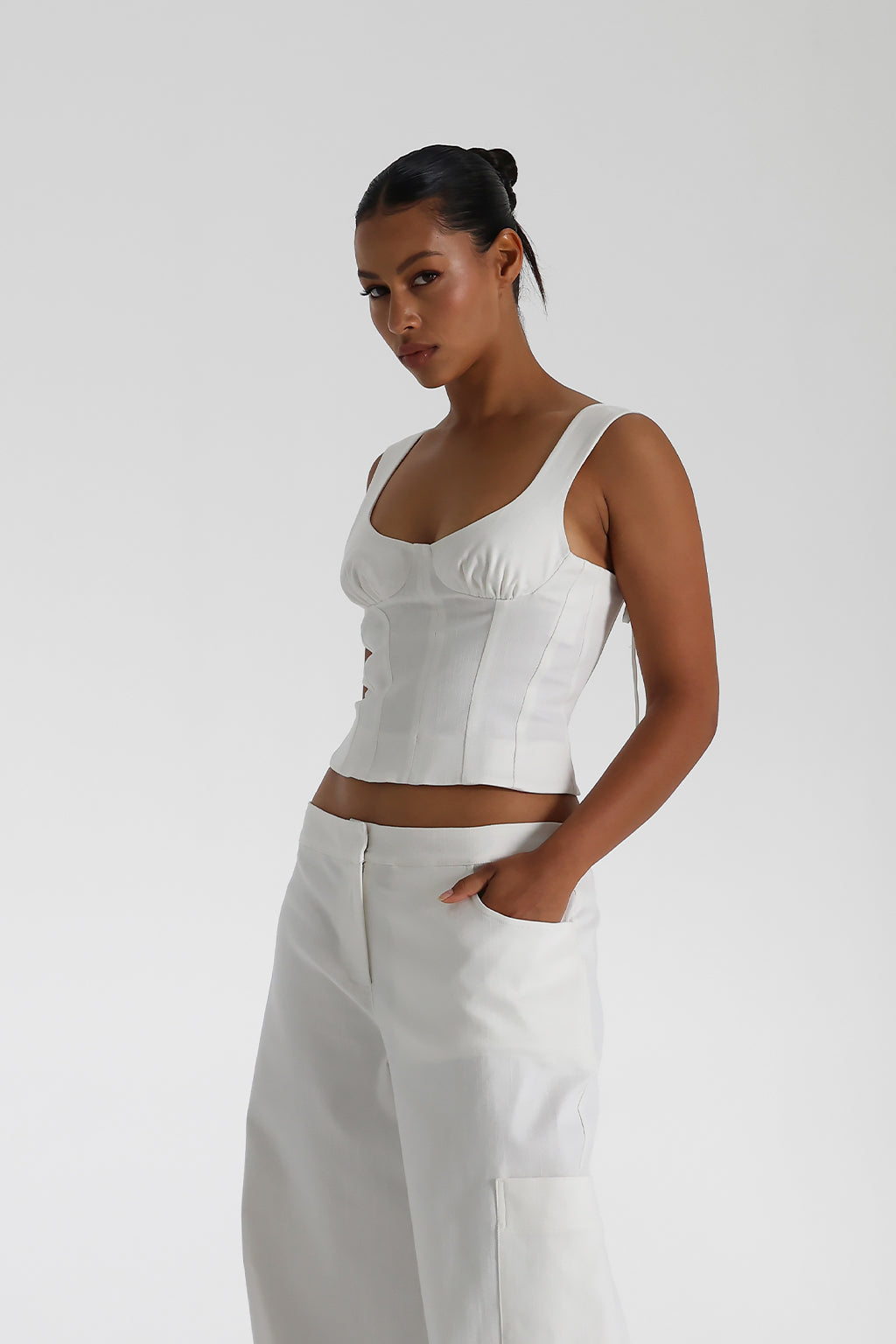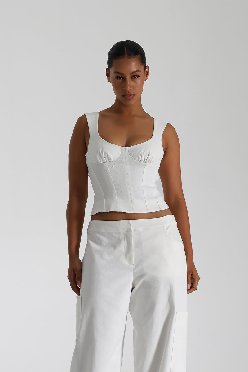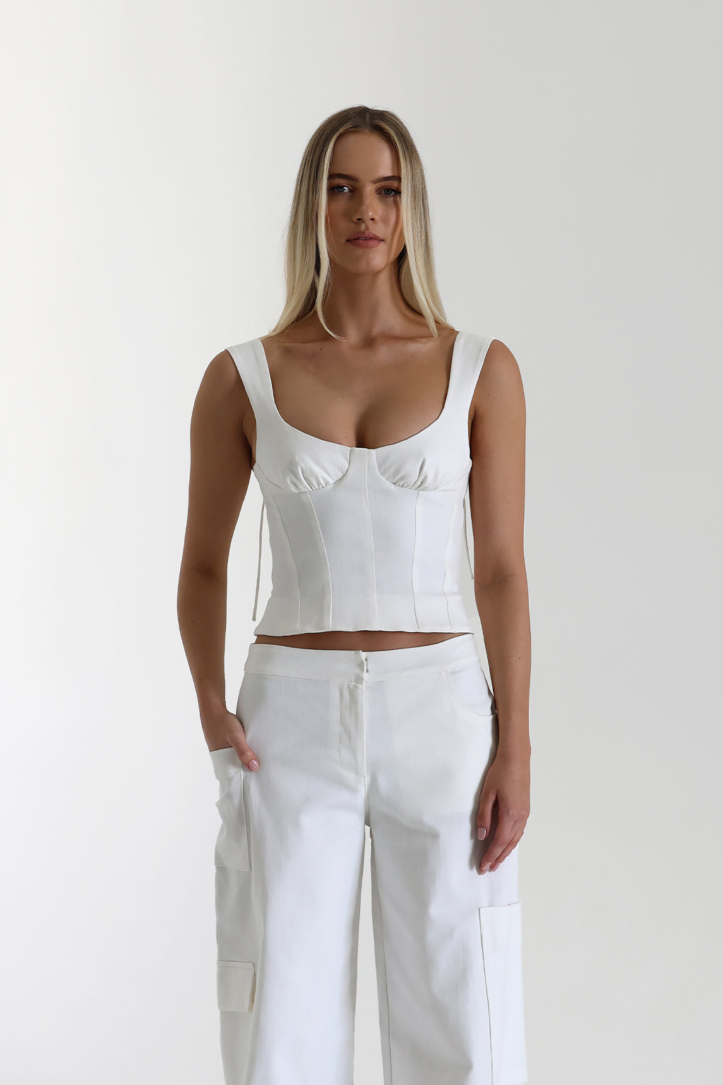 A longline bustier top to contour and shape. Wear the Kika Bustier with the Kyra Pant or Celia Short, or elevate your outfitting and style for versatility. Longline bustier top Gathered bust cup detail Tapered adjustable straps Adjustable back ties Contour seam detail. Drill. 97% Cotton. 3% Spandex.