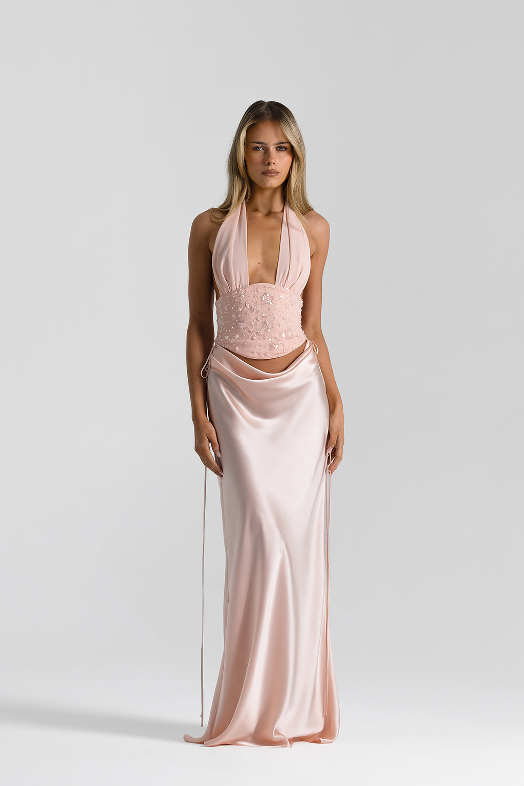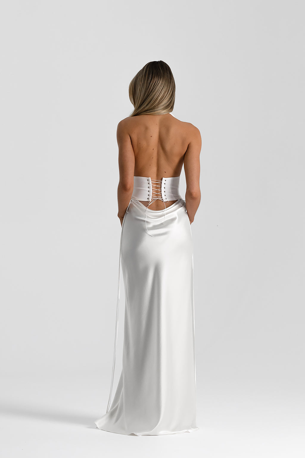 Bias cut silk Full length skirt silhouette French seams Waistline draping across front and back Elongated self silk ties, designed to connect to the Bronte Top & Verity Bustier. Crafted using a 19 momme silk. White uses a higher density of 26 momme, resulting in a slight price difference. To reduce shadowing, we recommend selecting undergarments closely matched to your skin tone.